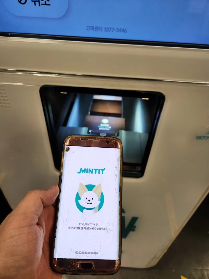 그 후 안내에 따라 핸드폰을 ATM 장비에 넣어 줍니다.